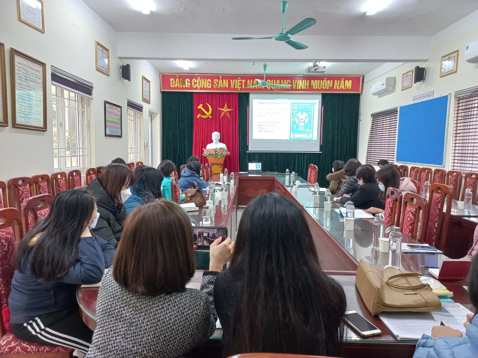Thực hiện công văn số 15/PGD&ĐT ngày 09/02/2022 của Phòng GD&ĐT quận Long Biên về việc tham dự Hội nghị trực tuyến công tác phòng chống dịch Covid-19 trong trường học khi đón học sinh trở lại học tập, trường mầm non Hồng Tiến đã cử đại diện Ban giám hiệu, giáo viên cốt cán, cán bộ y tế trường mầm non Hồng Tiến đã tham gia tập huấn trực tuyến cùng các trường mầm non, tiểu học, THCS trên địa bàn phường Bồ Đề tại trường tiểu học Ngọc Lâm.