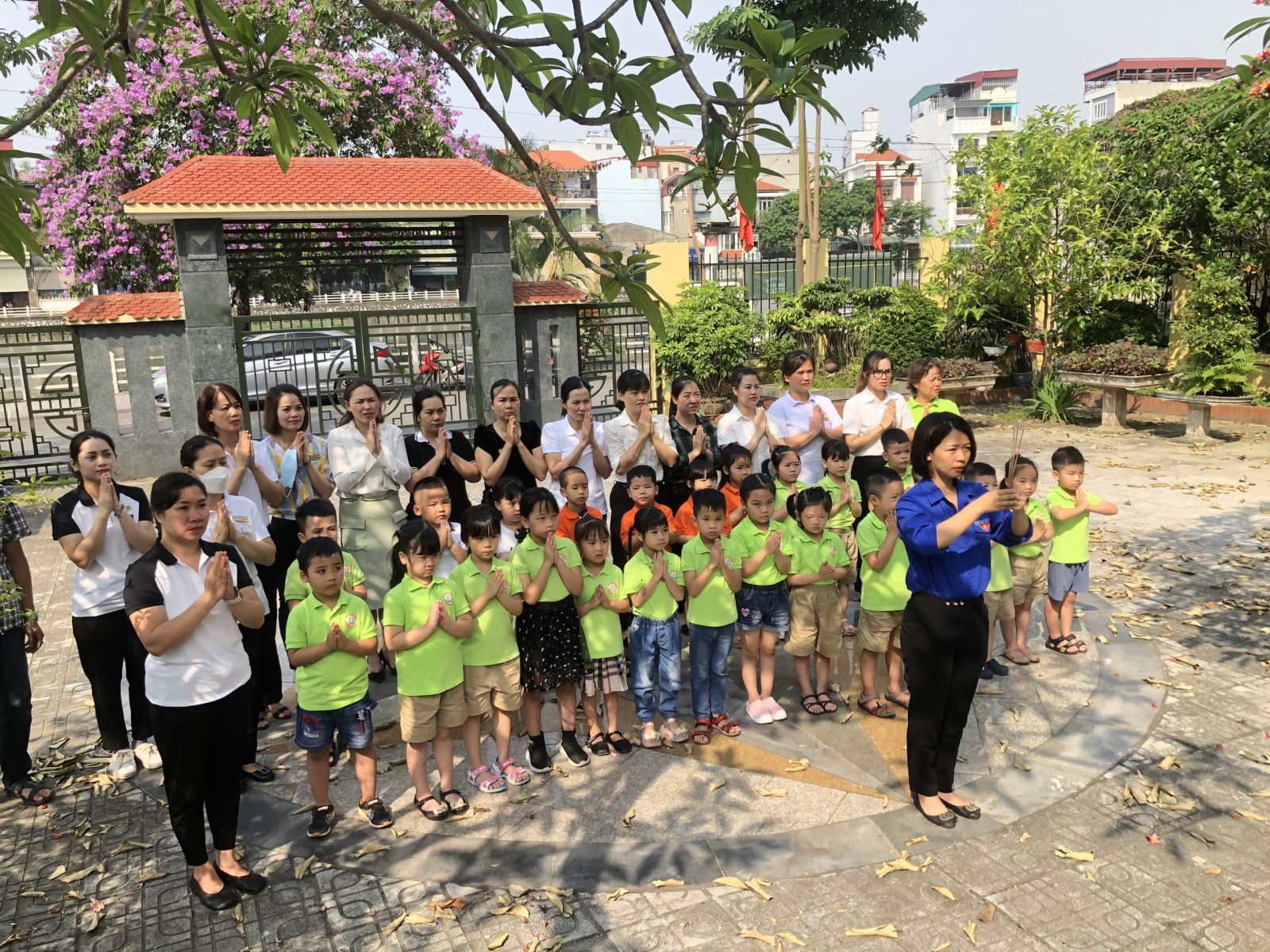 Đến trước đài tưởng niệm, toàn thể các cô và trò nghiêm trang làm lễ dâng hoa, dâng hương tưởng nhớ đến các anh hùng liệt sỹ. Đoàn đã dành một phút mặc niệm để tưởng nhớ công ơn của các anh hùng, liệt sĩ đã ngã xuống trong kháng chiến chống giặc ngoại xâm, bảo vệ thành quả cách mạng của đất nước. Tiếp đến lần lượt các cô và các bé lên thắp hương thể hiện lòng biết ơn và tri ân sâu sắc. Sau khi dâng hoa, dâng hương xong toàn thể BGH, giáo viên và các bé tham gia tổng dọn vệ sinh quanh khuôn viên đài tưởng niệm. Cháu nào cũng rất vui, rất thích thú khi được tham gia lao động và đó chính là ý thức, là những gì mà mỗi người lớn chúng ta mong đợi ở thế hệ mầm non.