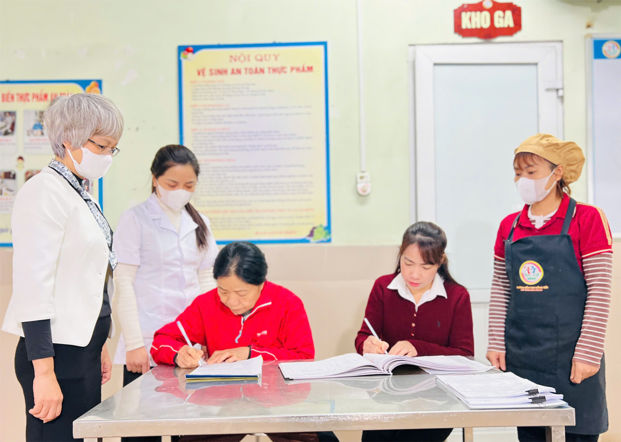 Hôm nay, ngày 20/11/2025 buổi giao nhận thực phẩm có đủ thành phần: ban giám hiệu nhà trường, nhân viên y tế, nhân viên nhà bếp, giáo viên, đại diện phụ huynh học sinh lớp MGB C2 cùng kiểm tra về chất lượng, số lượng thực phẩm, có ký xác nhận đầy đủ vào sổ giao nhận thực phẩm.
