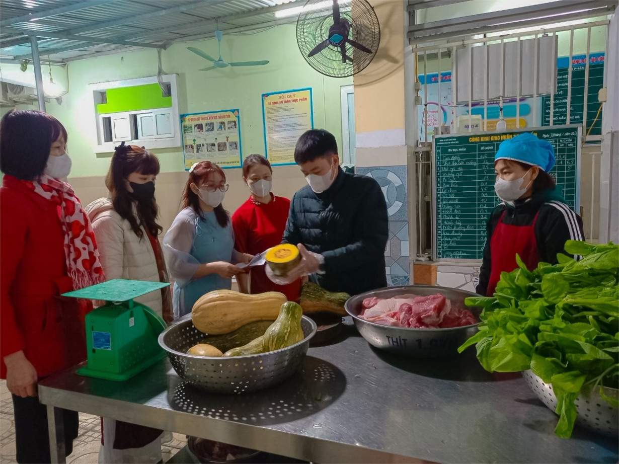 Hôm nay ngày 30/1/2024, có sự góp mặt của đại diện phụ huynh học sinh cùng Ban giám hiệu nhà trường, kế toán, nhân viên y tế, nhân viên nhà bếp, giáo viên cùng giao nhận, kiểm tra chất lượng thực phẩm, số lượng thực phẩm, có ký xác nhận đầy đủ vào sổ giao nhận thực phẩm.
