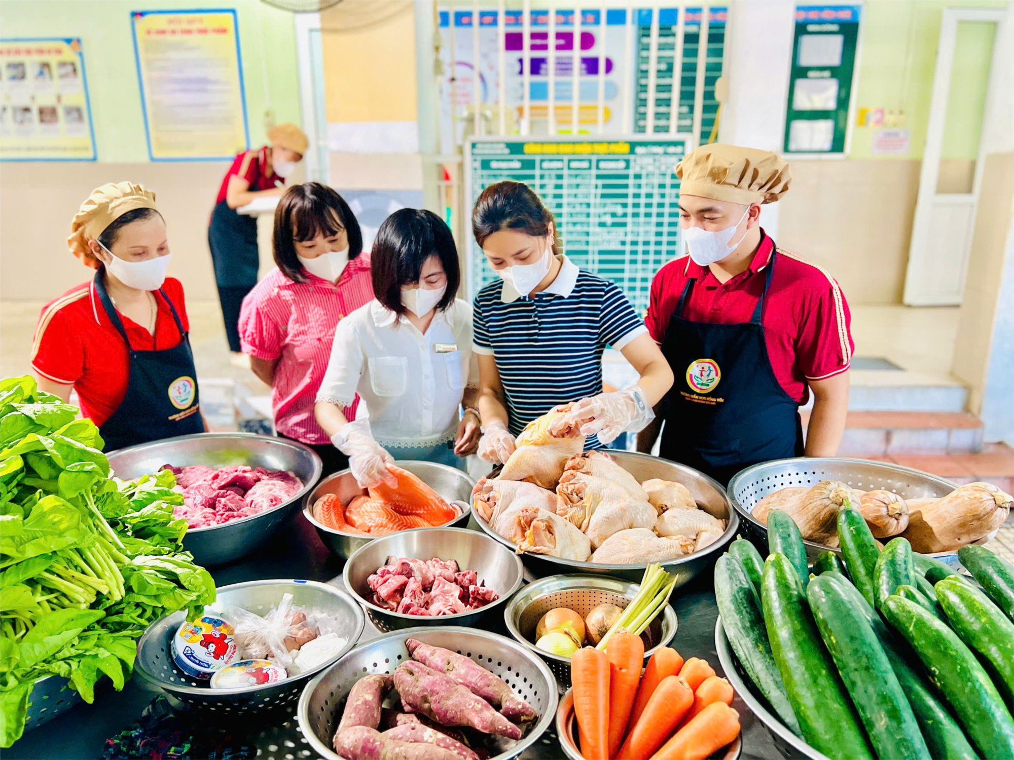 Đảm bảo cho trẻ có một sức khỏe tốt để học tập, vui chơi thì an toàn thực phẩm tại các bữa ăn bán trú đóng vai trò quan trọng trong chăm sóc trẻ. Nhận thức rõ tầm quan trọng của công tác này, trường Mầm non Hồng Tiến luôn chú trọng quản lý, tăng cường thực hiện tốt việc đảm bảo vệ sinh an toàn thực phẩm cho trẻ. Thực phẩm khi nhận vào trường phải luôn đảm bảo về số lượng và chất lượng. Quy trình giao nhận thực phẩm được thực hiện nghiêm túc với đầy đủ sự tham gia của các thành phần Ban giám hiệu, kế toán, nhân viên y tế, nhân viên nhà bếp và nhân viên giao thực phẩm trực tiếp tiếp nhận và kiểm tra chất lượng thực phẩm, số lượng thực phẩm có ký xác nhận đầy đủ vào sổ giao nhận thực phẩm.