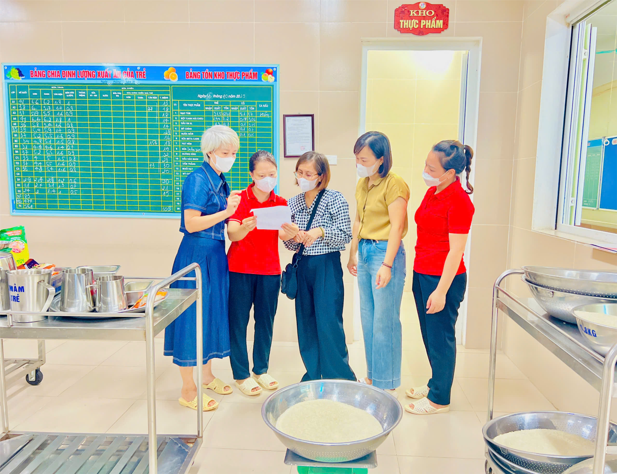 Công tác giao nhận thực phẩm trong nhà trường luôn được kiểm soát chặt chẽ. Thực phẩm khi nhận vào trường phải luôn đảm bảo về số lượng và chất lượng. Quy trình giao nhận thực phẩm được thực hiện nghiêm túc với sự tham gia của các thành phần: Ban giám hiệu, nhân viên kế toán, nhân viên y tế, ban phụ huynh, đại diện ban thanh tra nhân dân và giáo viên lớp trực tiếp nhận và kiểm tra chất lượng thực phẩm, có ký xác nhận đầy đủ vào sổ giao nhận thực phẩm.