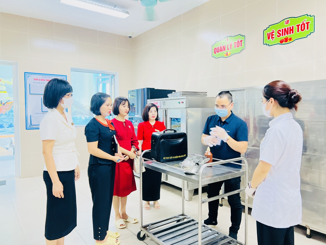 Các thành viên trong Đoàn đánh giá cao công tác chỉ đạo của Ban giám hiệu nhà trường; phòng y tế có đủ trang thiết bị và phác đồ sơ cấp cứu ban đầu; hồ sơ y tế học đường đầy đủ theo quy định. Các lớp học đảm bảo an toàn, đủ ánh sáng, môi trường sư phạm xanh, sạch, đẹp. Tuyên truyền phòng chống dịch bệnh, phòng chống tai nạn thương tích cho trẻ, triển khai tốt công tác bán trú, vệ sinh ATTP, lưu giữ đầy đủ hồ sơ giám sát, truy xuất nguồn gốc thực phẩm đảm bảo chất lượng