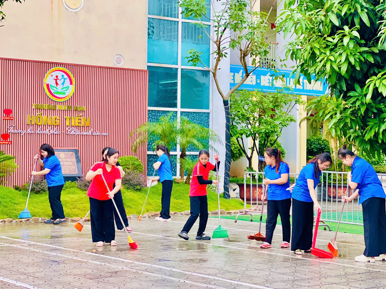 Nhằm chủ động phòng chống dịch bệnh sốt xuất huyết trong trường học CBGVNV phối hợp cùng đoàn viên mầm non #Hồng_Tiến tổ chức hoạt động tổng vệ sinh môi trường, phát quang, khơi thông cống rãnh, dọn dẹp các khu vực tiềm ẩn nguy cơ gây bệnh và mất an toàn trong khuôn viên nhà trường