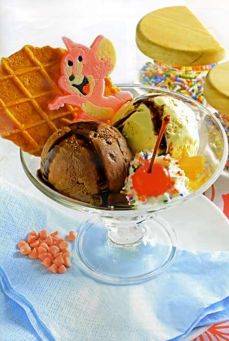 - Múc lần lượt 2 viên kem chocolate và kèm vani cho vào ly, rưới xốt chocolate lên. Xếp phần chuối còn lại, giữ cố định 2 viên kem trên. Bắt bông kem ở phía trước ly, rắc hạt cốm màu lên, đĩnh quả cherry trang trí. Bánh quế nướng cắm phía sau làm nền. Cho kẹo dẻo ở phái trên cùng.