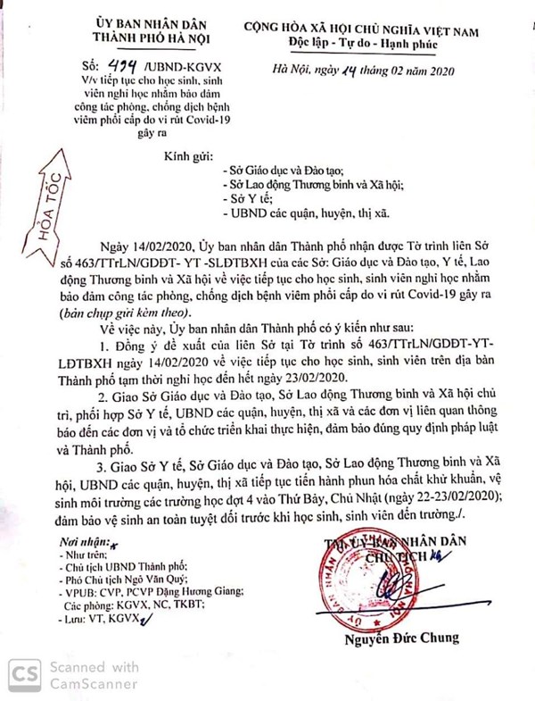 Để bảo đảm công tác phòng, chống dịch viêm đường hô hấp cấp do virut CoVid-19 gây ra, UBND thành phố thông báo cho các trường THPT, THCS,TH, MN và TTGDNN tiếp tục nghỉ học đến hết ngày 23/02/2020.