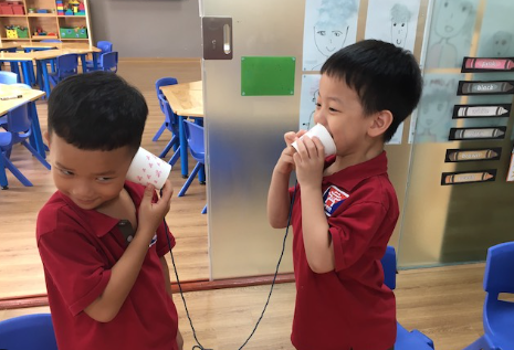 Bước 1: Ba mẹ khoé !important;t một lỗ nhỏ ở phần đáy ly giấy, luồn sợi dây thừng qua lỗ nhỏ ở ly thứ nhất rồi luồn sang ly thứ 2.