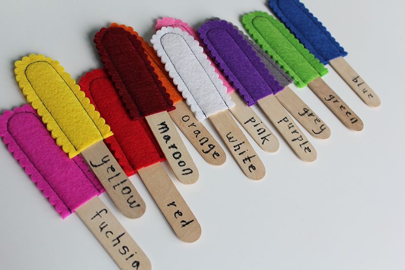 Bước 1: Cắt vải hoặc giấy mà !important;u thành những hình thù khác nhau như: vuông, tròn, tam giác, chữ nhật,…Bước 2: Dán phần vải hoặc giấy màu đã cắt lên những que kem Bước 3: Bạn hãy ghi tên các loại màu sắc lên que kem để bé ghi nhớ dễ hơn