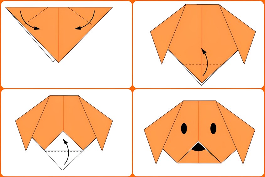 Bước 2: Gấp đuô !important;i giấy lên tạo hình mặt chó, rồi dùng bút vẽ mắt mũi. Thế là đã hoàn thành chú chó đáng yêu.