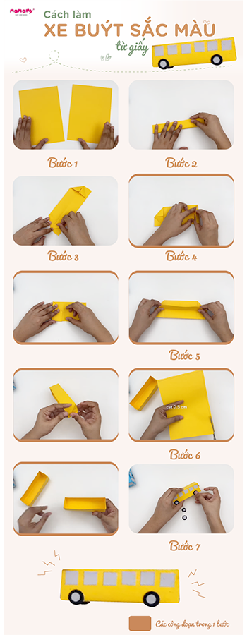 Bước 6: Với ½ tờ giấy còn lại, mẹ cắt viền 0.5 cm 2 cạnh và thực hiện tương tự các bước trên để được 1 khung thân xe bus nhỏ hơn rồi úp ngược vào thân xe bus đã làm ở bước 5.