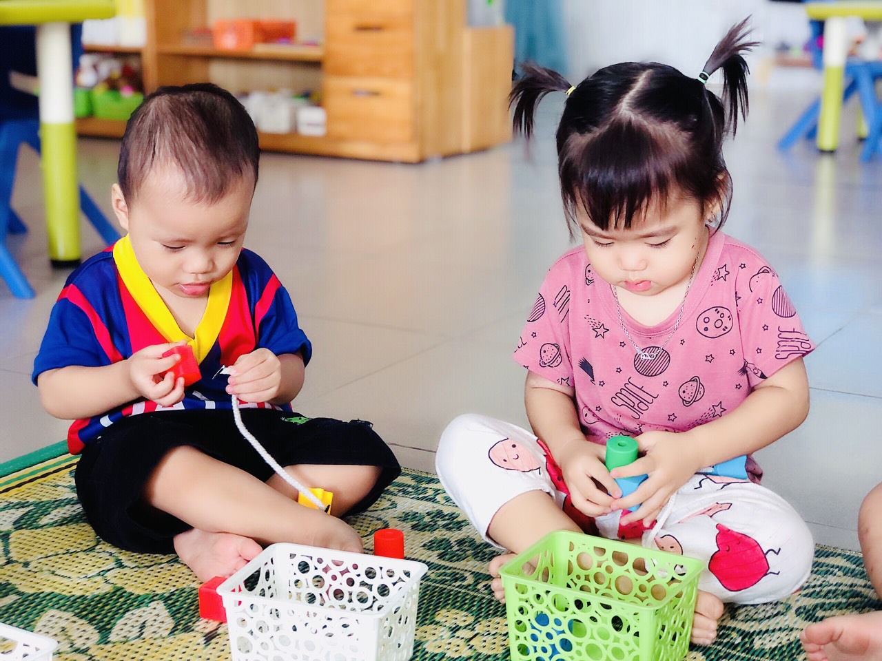 Đối với trẻ lứa tuổi nhà trẻ thì hoạt động với đồ vật có ý nghĩa vô cùng quan trọng. Hoạt động với đồ vật rèn cho trẻ sự khéo léo của đôi bàn tay để tạo ra những sản phẩm mà mình yêu thích. Thông qua hoạt động với đồ vật, trẻ được phát triển kỹ năng vận động tinh của bàn tay, ngón tay và sự phối hợp tay, mắt trong hoạt động, rèn luyện kỹ năng tự phục vụ như lấy và cất đồ dùng, đồ chơi đúng nơi quy định. Xâu hạt là một bước trợ giúp thêm cho độ chính xác của các động tác và hoạt động của các ngón tay. Xin mời các bố mẹ hãy ngắm nhìn các con với một bàn tay nhỏ xíu, với cái dây nhỏ xíu vậy mà bạn nào cũng khéo léo xâu qua được những hạt vòng dễ dàng, đáng yêu lắm. Những con ong chăm chỉ của lớp 24-36 tháng D2 đây ạ!