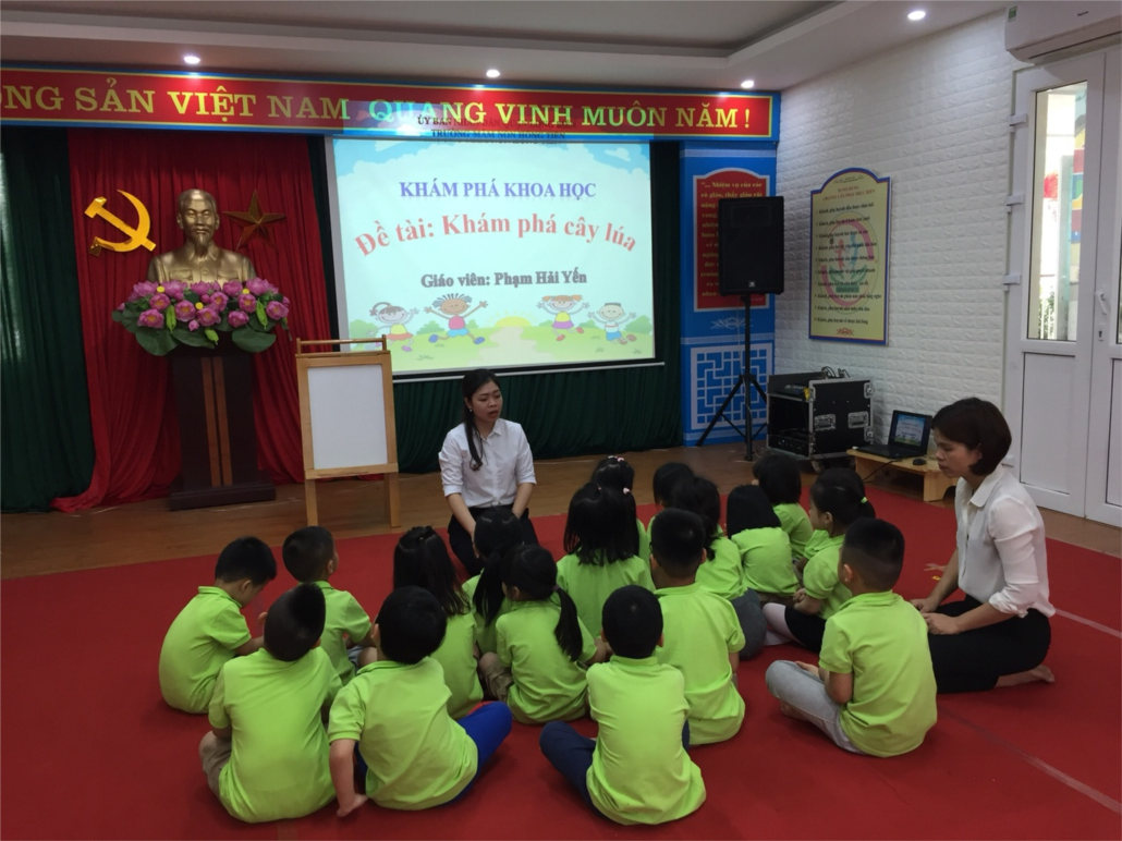 Tại lớp MGL A3, cô giáo hải Yến, Thanh Xuân với chuyên đề Khám phá khoa học, các giáo viên đã lựa chọn đề tài: Khám phá cây lúa. Đây thực sự là một tiết học với những trải nghiệm vô cùng thú vị giúp trẻ được tìm hiểu về một loại cây lương thực chính của nước ta.