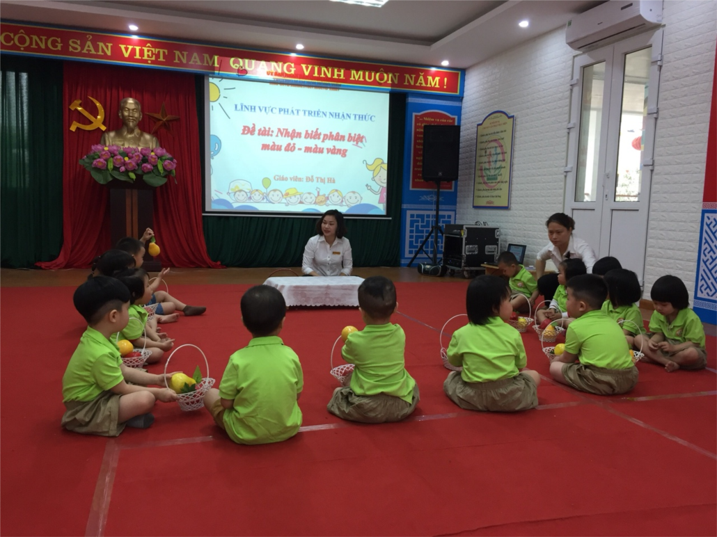 Phong thái tổ chức hoạt động học duyên dáng nhẹ nhàng của cô giáo Đỗ Thị Hà và cô giáo Nguyễn Thị Lan Anh đã thu hút trẻ tham gia tích cực vào hoạt động nhận biết màu đỏ-màu vàng.