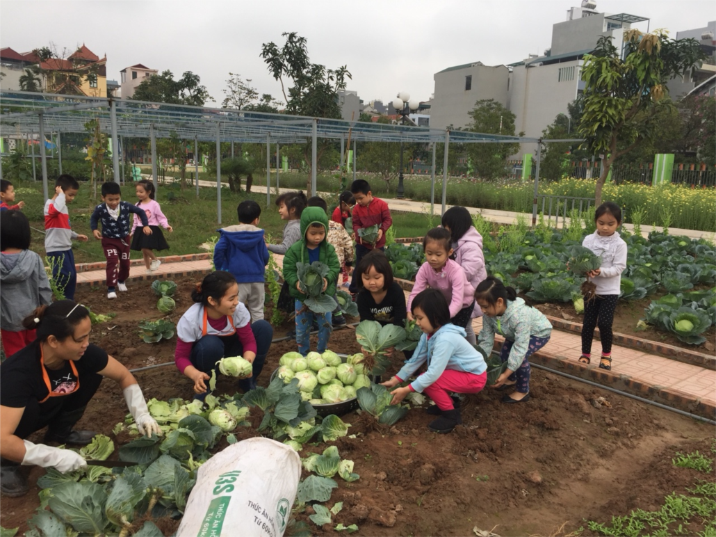 Hình ảnh các bé thu hoạch rau bắp cải