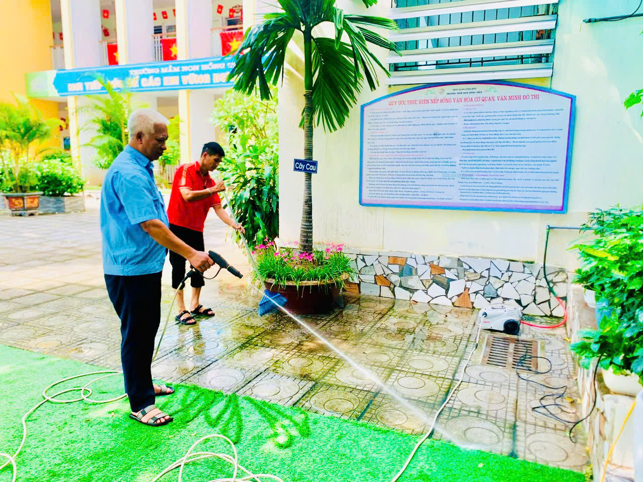 - Phát quang cây cảnh, làm cỏ các bồn cây, khơi thông cống rãnh, hệ thống nước thải trong trường học hàng ngày, hàng tuần, hàng tháng,… tránh tình trạng rác thải ùn đọng, gây ô nhiễm môi trường, ảnh hưởng đến sức khỏe học sinh. Tạo cảnh quan thoáng đãng đảm bảo môi trường luôn Xanh- Sạch- Đẹp.
