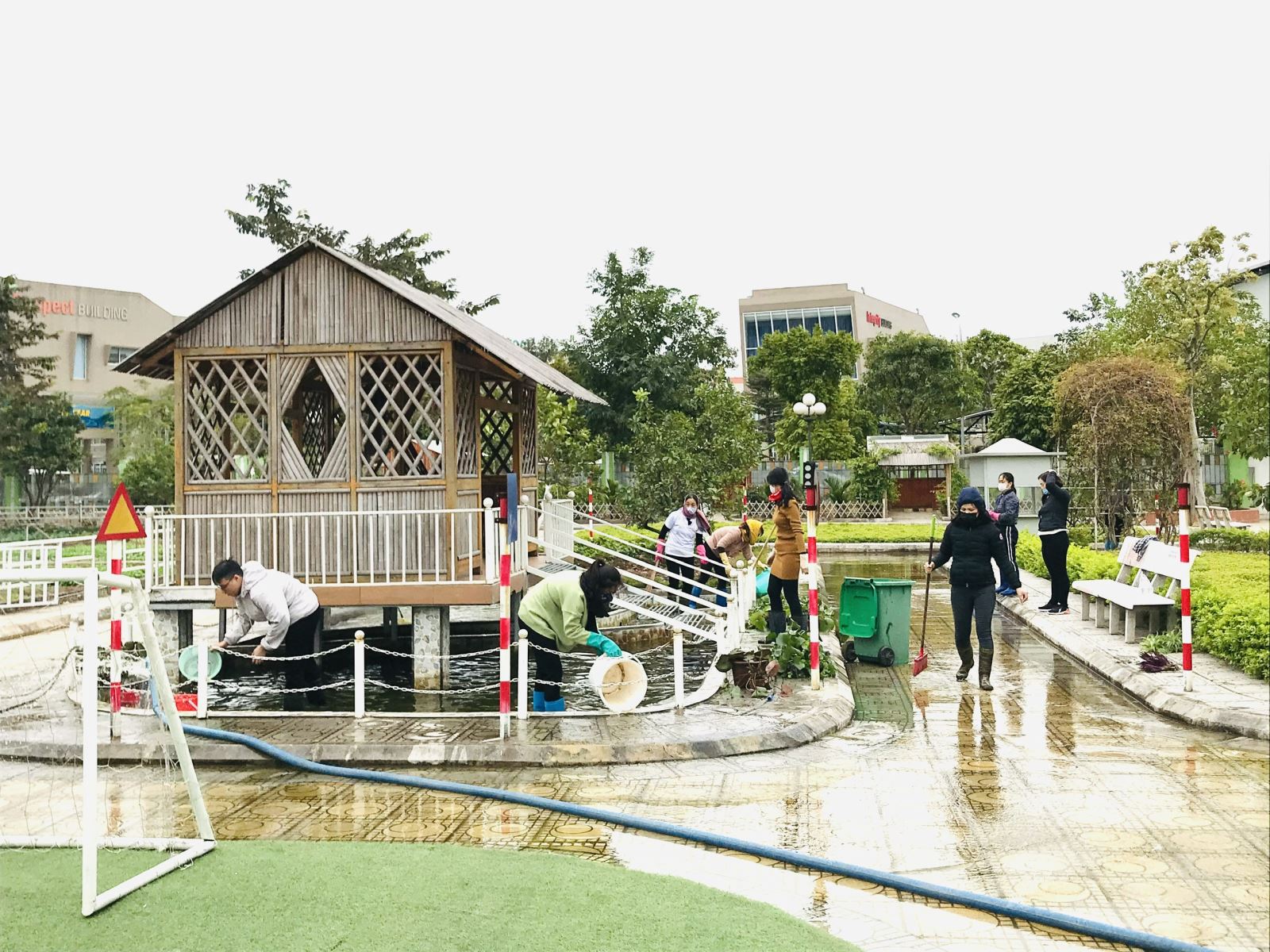 oC, cảm giác cái lạnh giá buốt xuyên thấu khắp cơ thể. Dù thời tiết khắc nghiệt đến như vậy nhưng cũng không ngăn cản được tinh thần nhiệt huyết của toàn thể đảng viên trong chi bộ trường mầm non Hồng Tiến cùng đội ngũ giáo viên, nhân viên của nhà trường đã quyết tâm tổng vệ sinh môi trường nạo vét bùn đất rêu xanh, cải tạo lại môi trường nước của bể cá tại khu vui chơi, trải nghiệm dành cho trẻ.