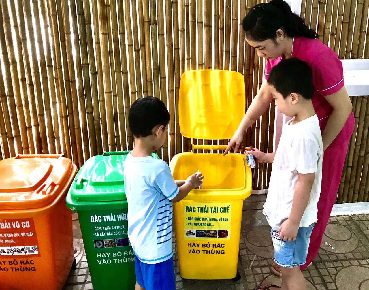 Trường MN Hồng Tiến đặc biệt quan tâm đến vấn đề dạy trẻ cách phan loại và tái chế rác thải nhựa và đặc biệt là ý thức hạn chế sử dụng túi nilong và các đồ dùng gây ảnh hưởng tới môi trường.
