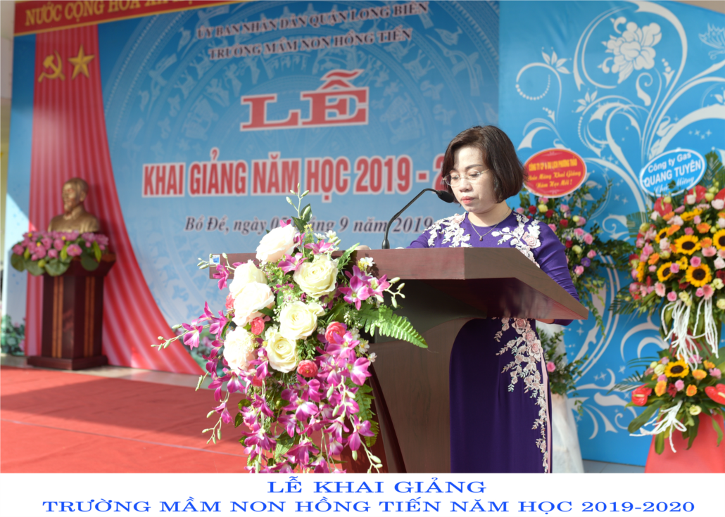 Trong niềm vui, xúc động và tự hào, đồng chí Lưu Thị Ngọc Diệp – Bí thư Chi bộ, Hiệu trưởng nhà trường đã đọc thư của Chủ tịch nước; diễn văn khai giảng năm học 2019 – 2020 và báo cáo thành tích mà nhà trường đã đạt được trong năm học vừa qua. Năm học 2018 – 2020, trường MN Hồng Tiến rất vinh dự đạt danh hiệu “Tập thể lao động xuất sắc cấp Thành phố và là trường điểm trong công tác quản lý nuôi dưỡng cấp Quận, các hoạt động giáo dục trong nhà trường đều có sự chuyển biến tích cực và đạt những kết quả cao. Cơ sở vật chất nhà trường ngày càng được bổ sung, hoàn thiện theo hướng chuẩn quốc gia, đáp ứng nhu cầu dạy và học. Khung cảnh sư phạm nhà trường luôn Sáng – Xanh – Sạch – Đẹp – Văn minh.