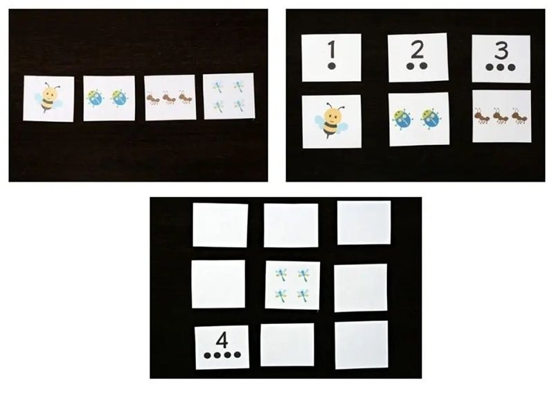 Thứ ba, cách tổ chức trò chơi thẻ côn trùng này sẽ giúp trẻ rèn luyện trí nhớ. Bạn lật tấm thẻ hình côn trùng và đặt ở giữa 6 tấm thẻ số xung quanh. Cho trẻ rèn luyện trí nhớ bằng cách lật các thẻ số đang úp sao cho tìm được chữ số tương ứng với số con côn trùng trên thẻ hình côn trùng.